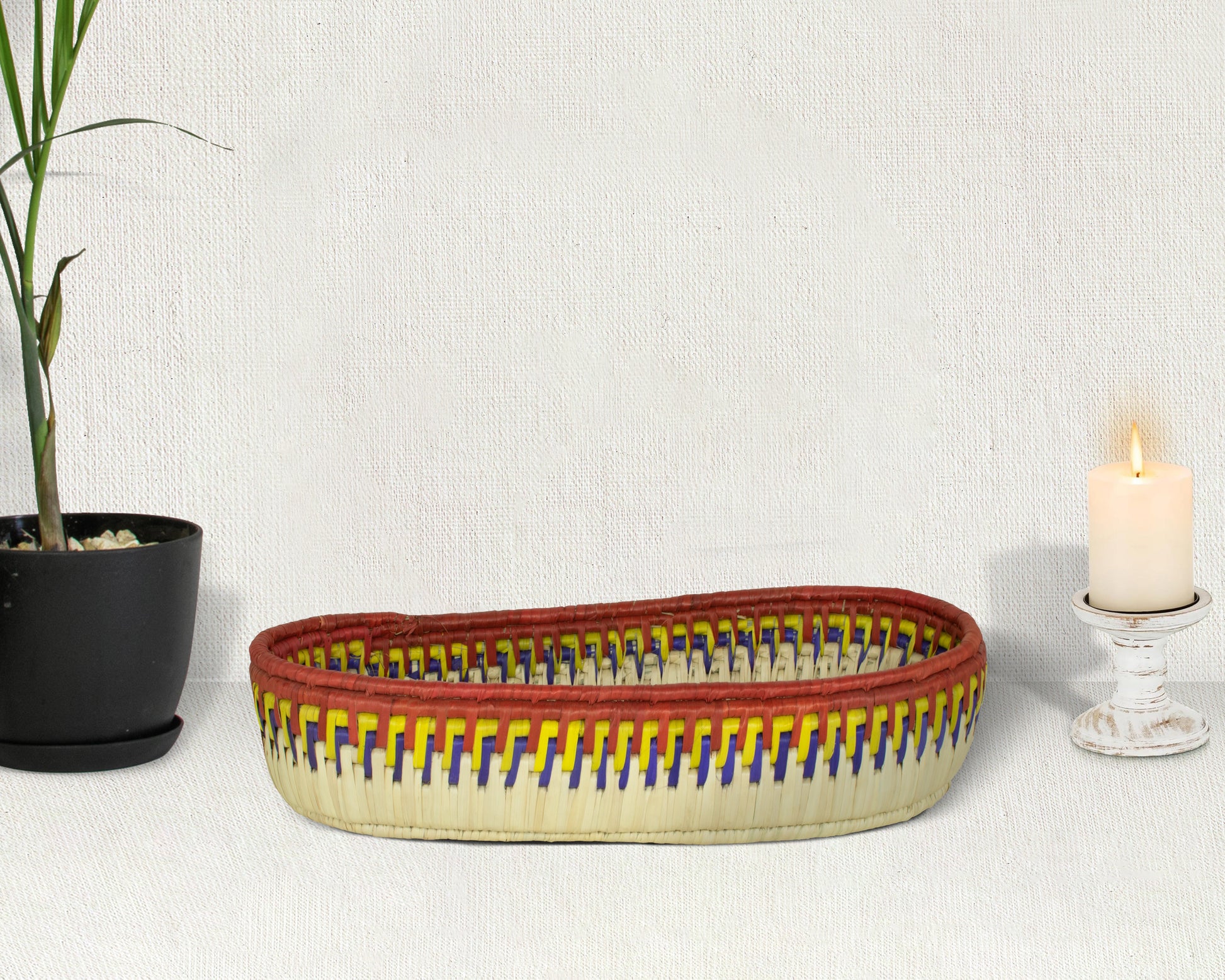 Skillfully crafted from handwoven palm leaves, wheat straws, and natural vegetable plant-dyes, each tray carries the essence of sustainability and tradition. Whether used as a serving basket, countertop organizer, or a decorative wall accent, this versatile piece enhances any bohemian, farmhouse, or minimalist interior with its natural texture and earthy tones.