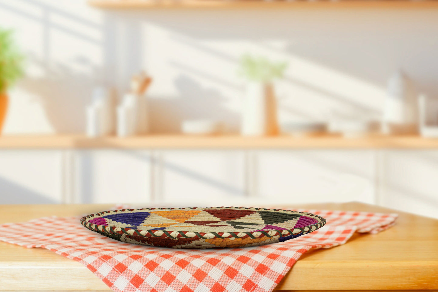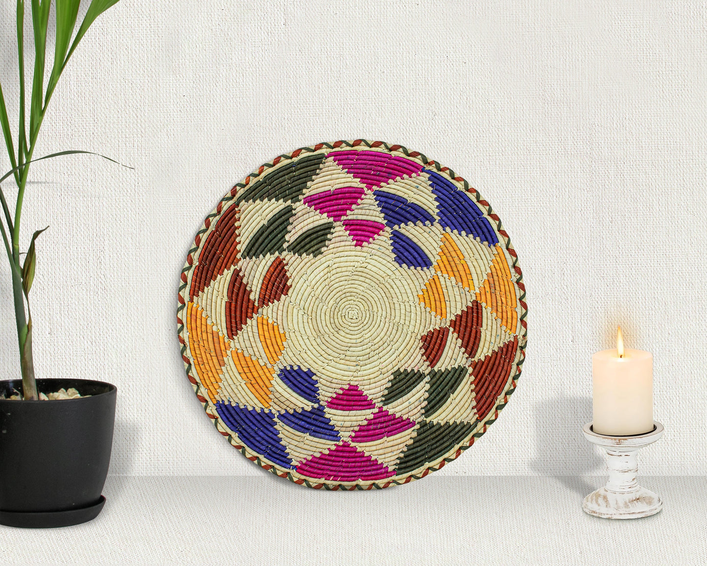 Bring warmth, texture, and artisanal beauty into your space with our bohemian elegance to your home with our 12-inch Handwoven Flat Basket - A perfect blend of rustic beauty and artisan craftsmanship. Woven from natural palm leaves, sea grass, and plant-based dyes. This stunning basket brings warmth, texture, and an organic feel to any space.