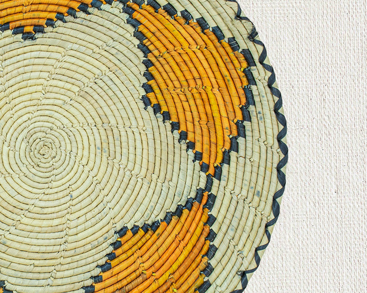 Bring warmth, texture, and artisanal beauty into your space with our bohemian elegance to your home with our 12-inch Handwoven Flat Basket - A perfect blend of rustic beauty and artisan craftsmanship. Woven from natural palm leaves, sea grass, and plant-based dyes. This stunning basket brings warmth, texture, and an organic feel to any space.