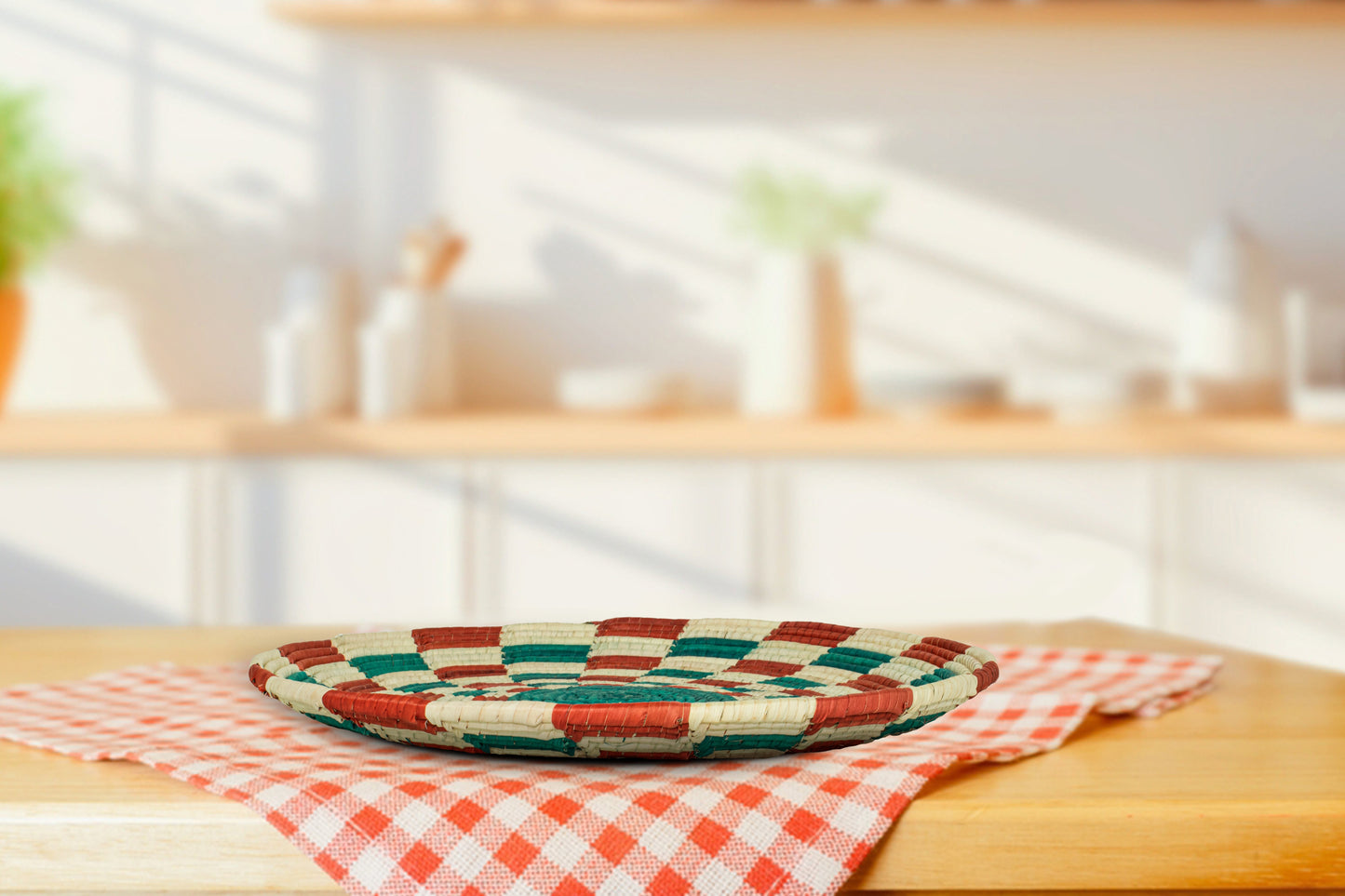 Bring warmth, texture, and artisanal beauty into your space with our bohemian elegance to your home with our 12-inch Handwoven Flat Basket - A perfect blend of rustic beauty and artisan craftsmanship. Woven from natural palm leaves, sea grass, and plant-based dyes. This stunning basket brings warmth, texture, and an organic feel to any space.