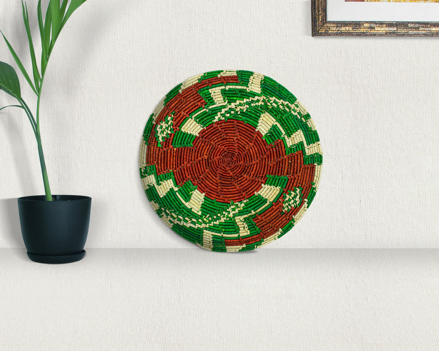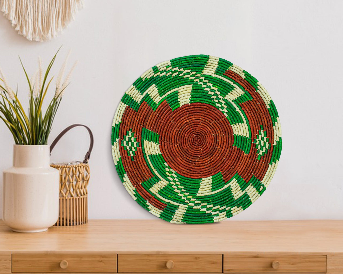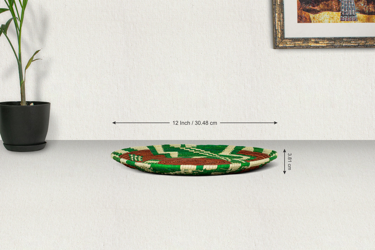 Bring warmth, texture, and artisanal beauty into your space with our bohemian elegance to your home with our 12-inch Handwoven Flat Basket - A perfect blend of rustic beauty and artisan craftsmanship. Woven from natural palm leaves, sea grass, and plant-based dyes. This stunning basket brings warmth, texture, and an organic feel to any space.