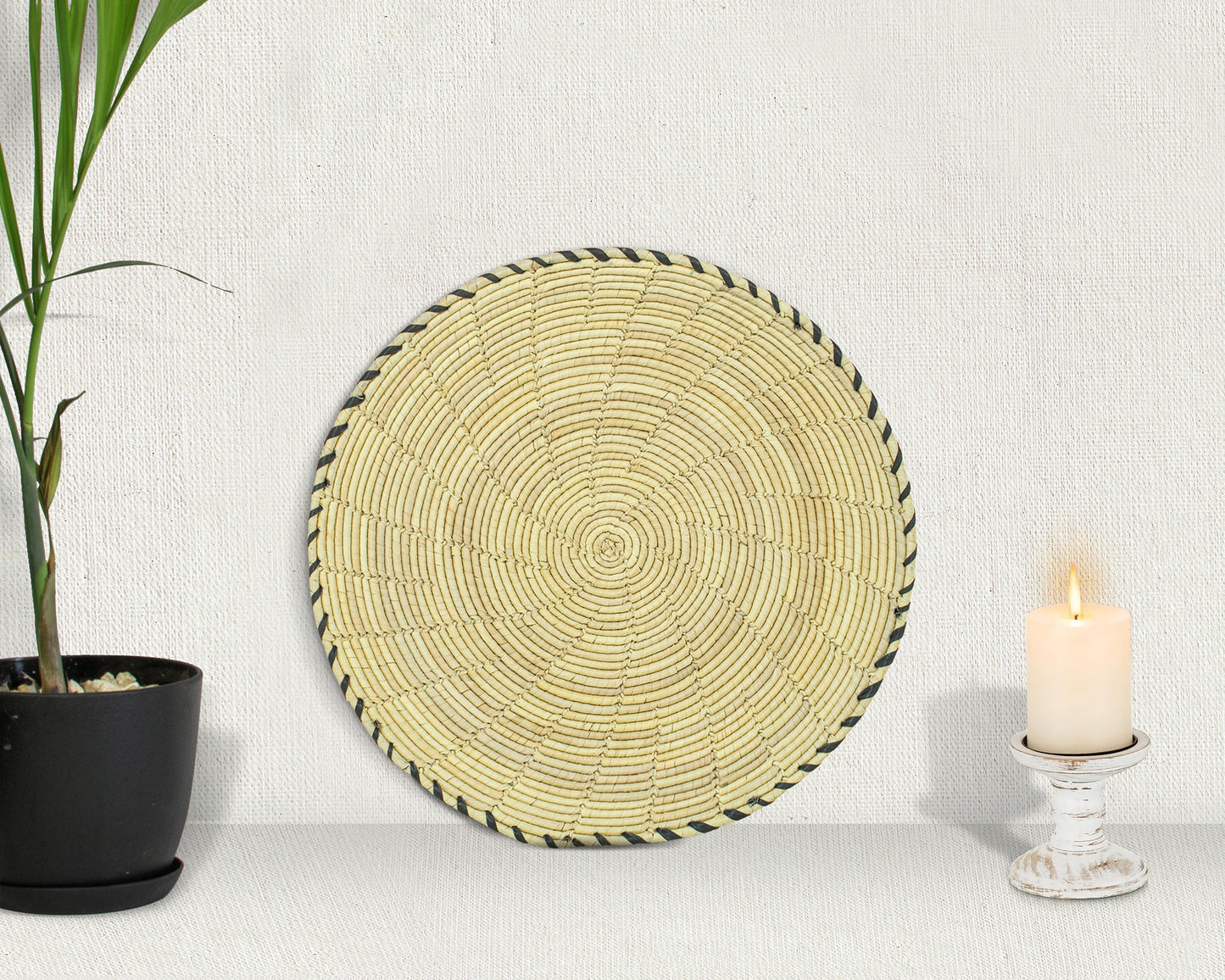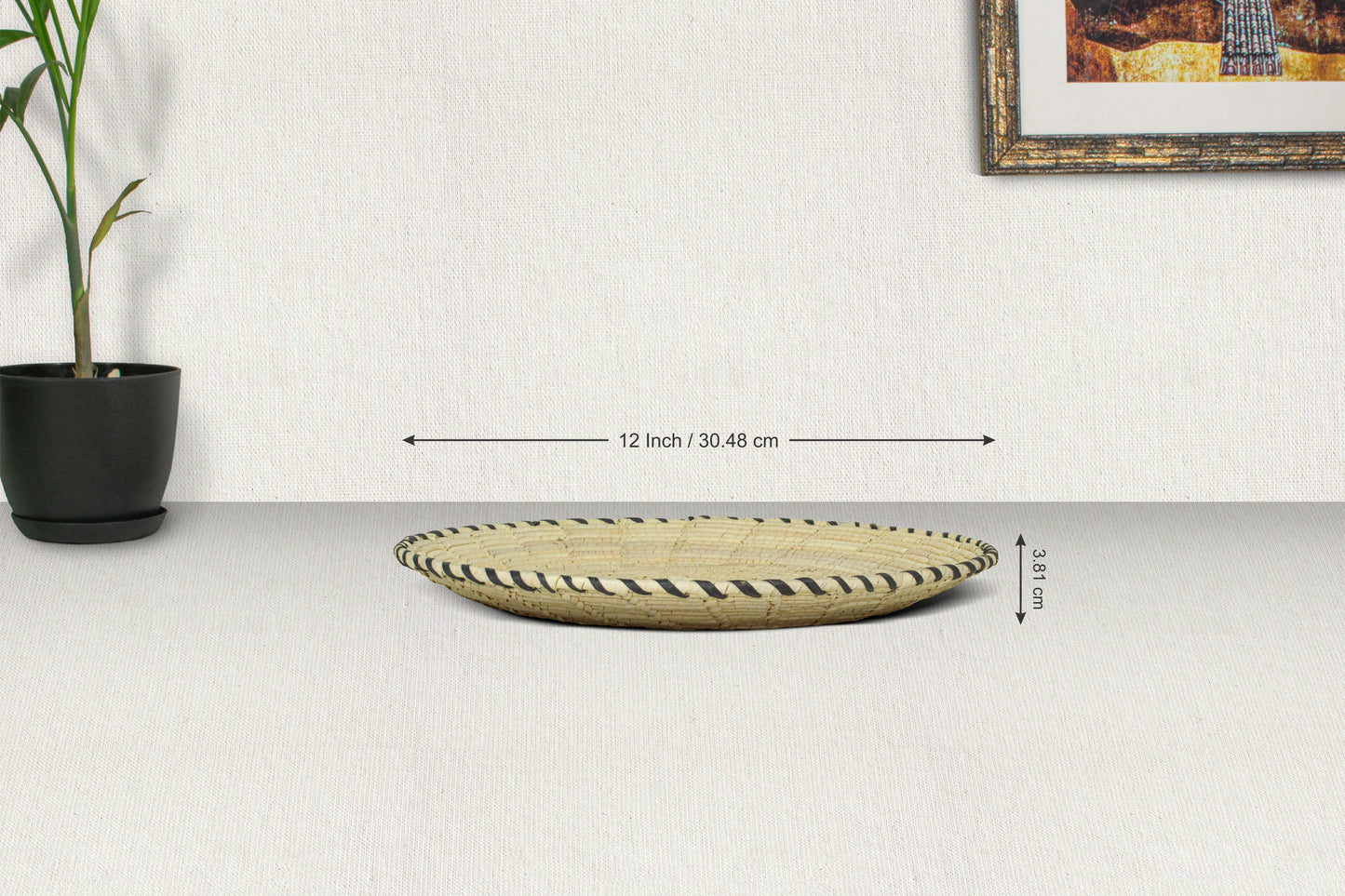 Bring warmth, texture, and artisanal beauty into your space with our bohemian elegance to your home with our 12-inch Handwoven Flat Basket - A perfect blend of rustic beauty and artisan craftsmanship. Woven from natural palm leaves, sea grass, and plant-based dyes. This stunning basket brings warmth, texture, and an organic feel to any space.