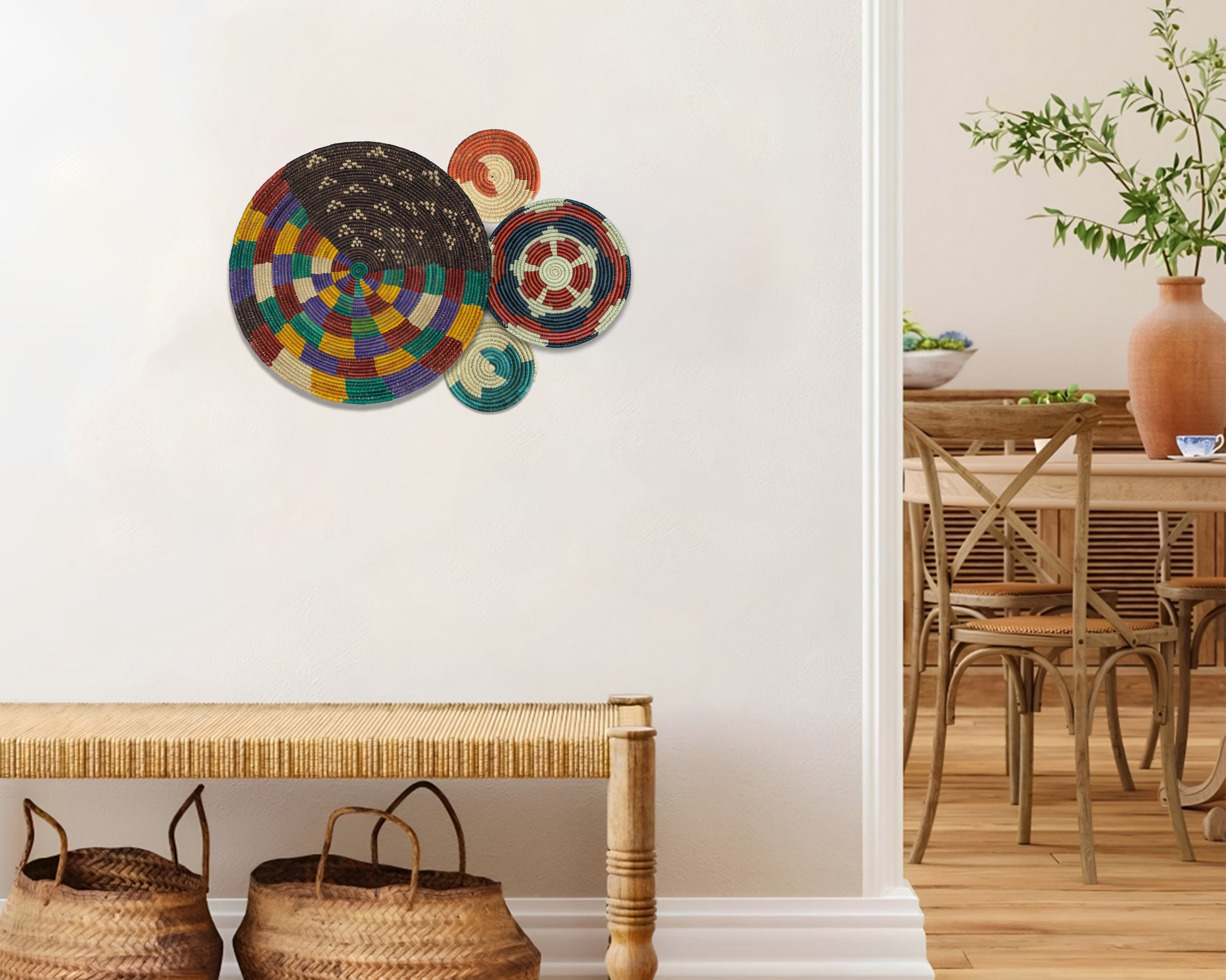 Each basket in this set is uniquely woven by skilled artisans, ensuring one-of-a-kind patterns and intricate details that add depth and character to any space. Whether you arrange them as a statement wall display, use them as tabletop decor, or incorporate them into a gallery wall, these baskets effortlessly enhance Boho, farmhouse, rustic, and modern interiors.
