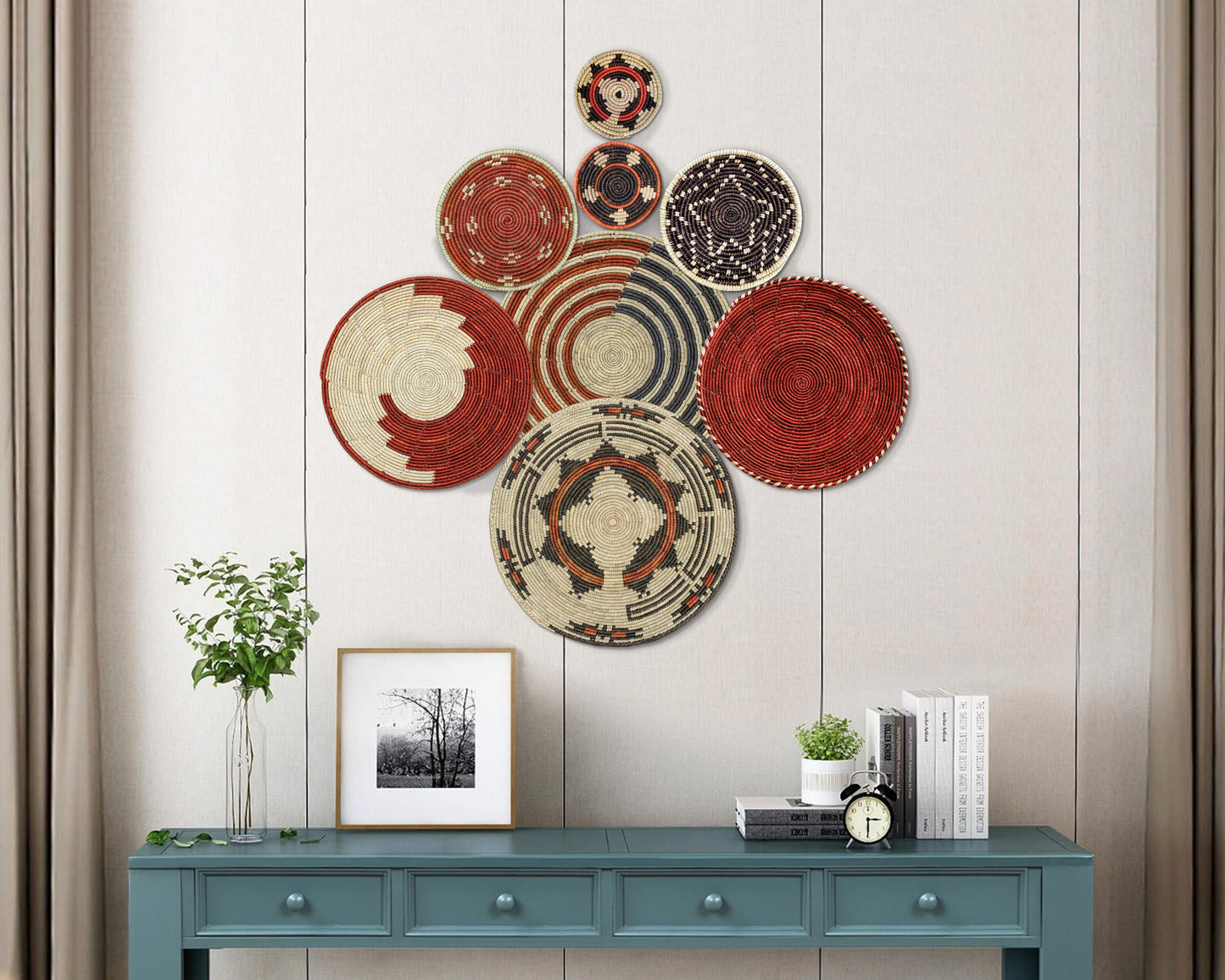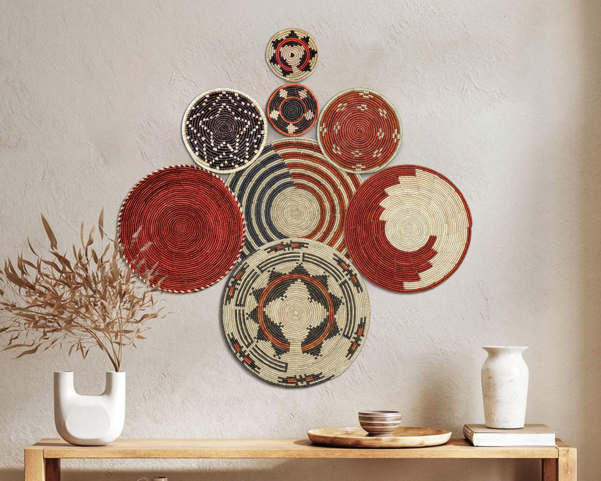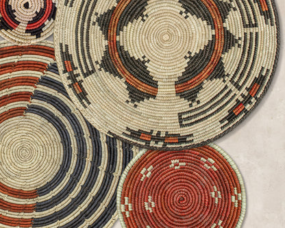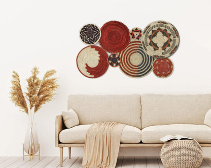 Each basket in this set is uniquely woven by skilled artisans, ensuring one-of-a-kind patterns and intricate details that add depth and character to any space. Whether you arrange them as a statement wall display, use them as tabletop decor, or incorporate them into a gallery wall, these baskets effortlessly enhance Boho, farmhouse, rustic, and modern interiors.