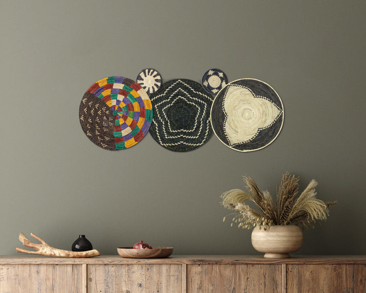 Each basket in this set is uniquely woven by skilled artisans, ensuring one-of-a-kind patterns and intricate details that add depth and character to any space. Whether you arrange them as a statement wall display, use them as tabletop decor, or incorporate them into a gallery wall, these baskets effortlessly enhance Boho, farmhouse, rustic, and modern interiors.