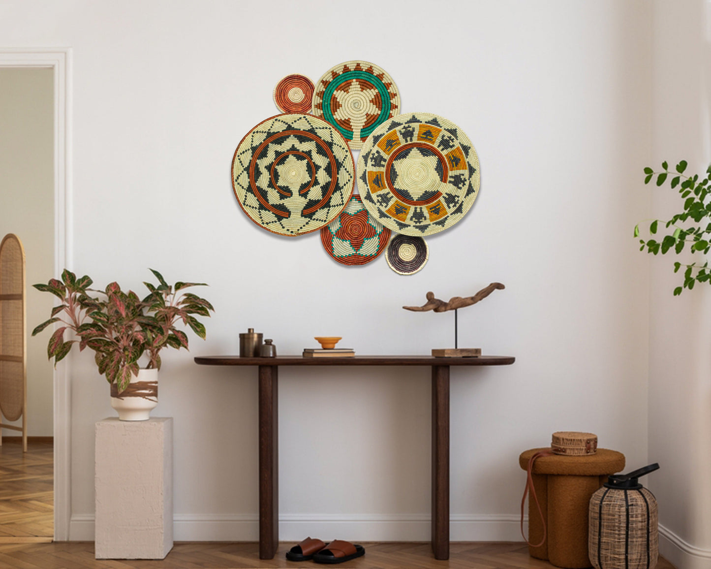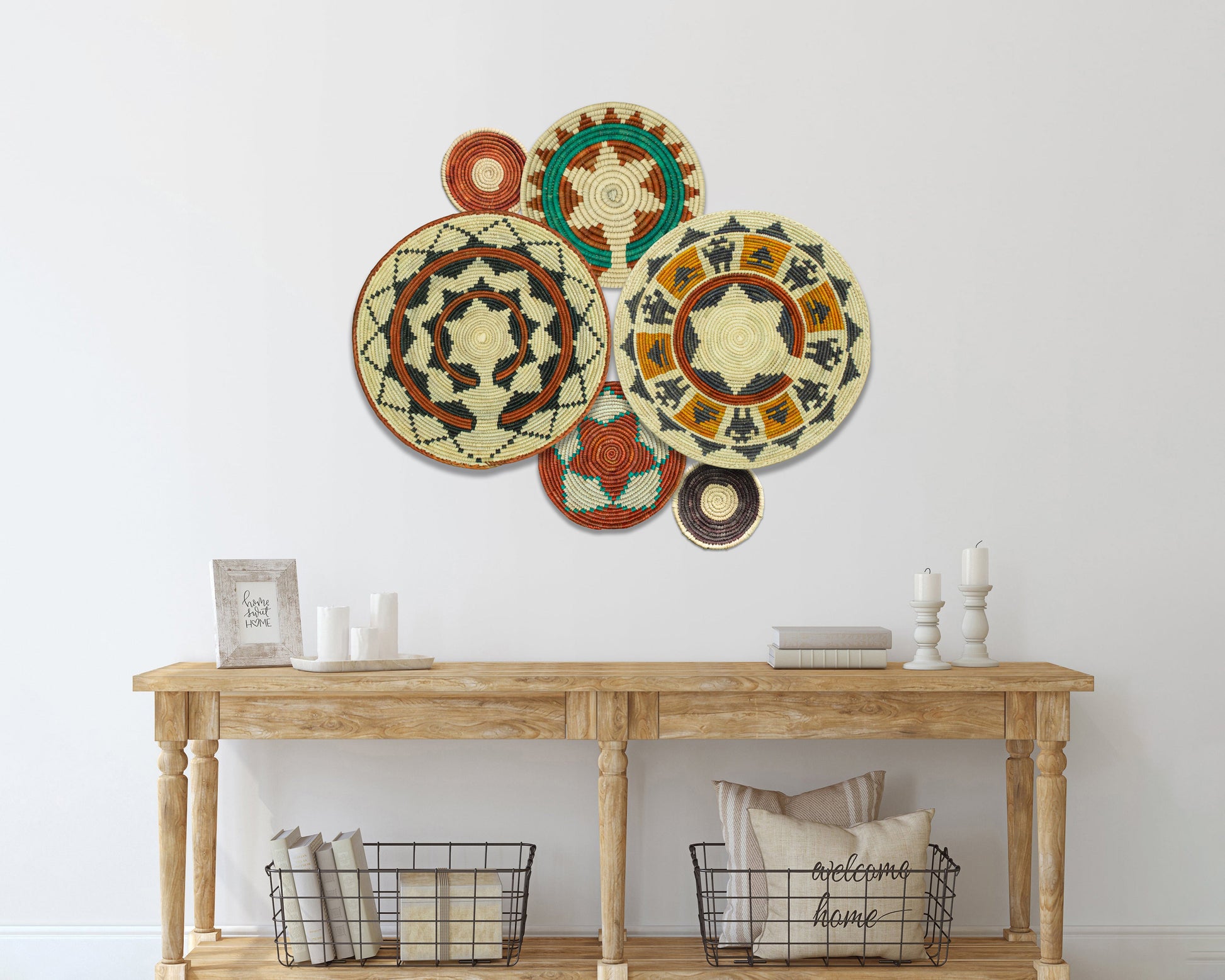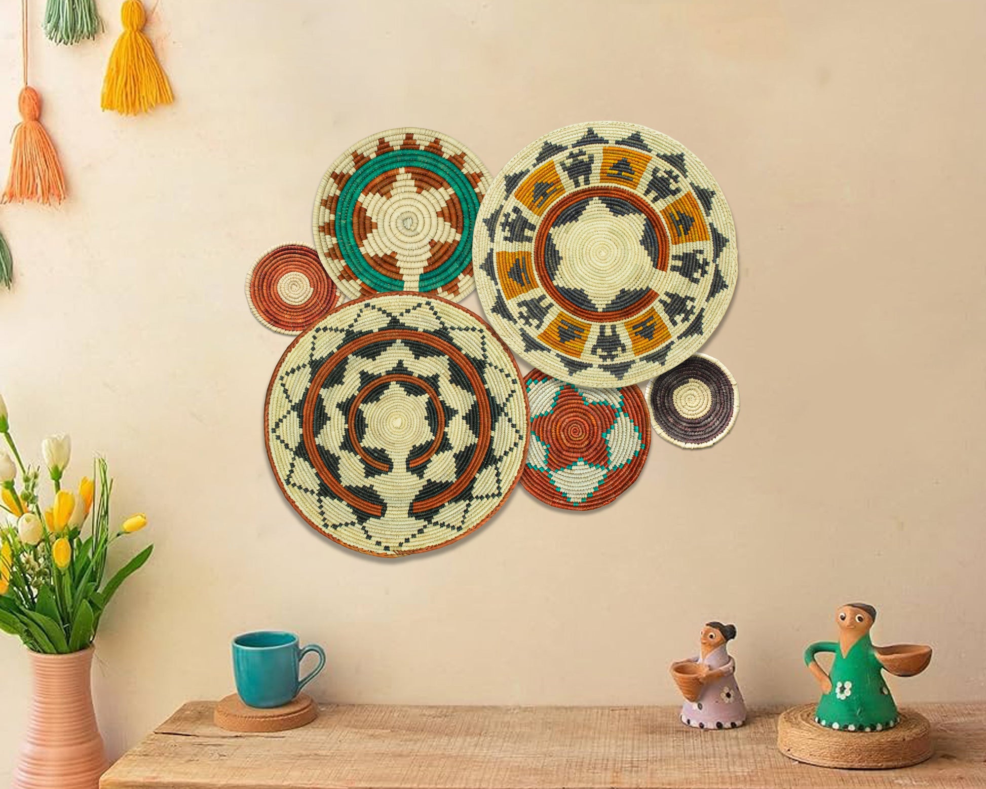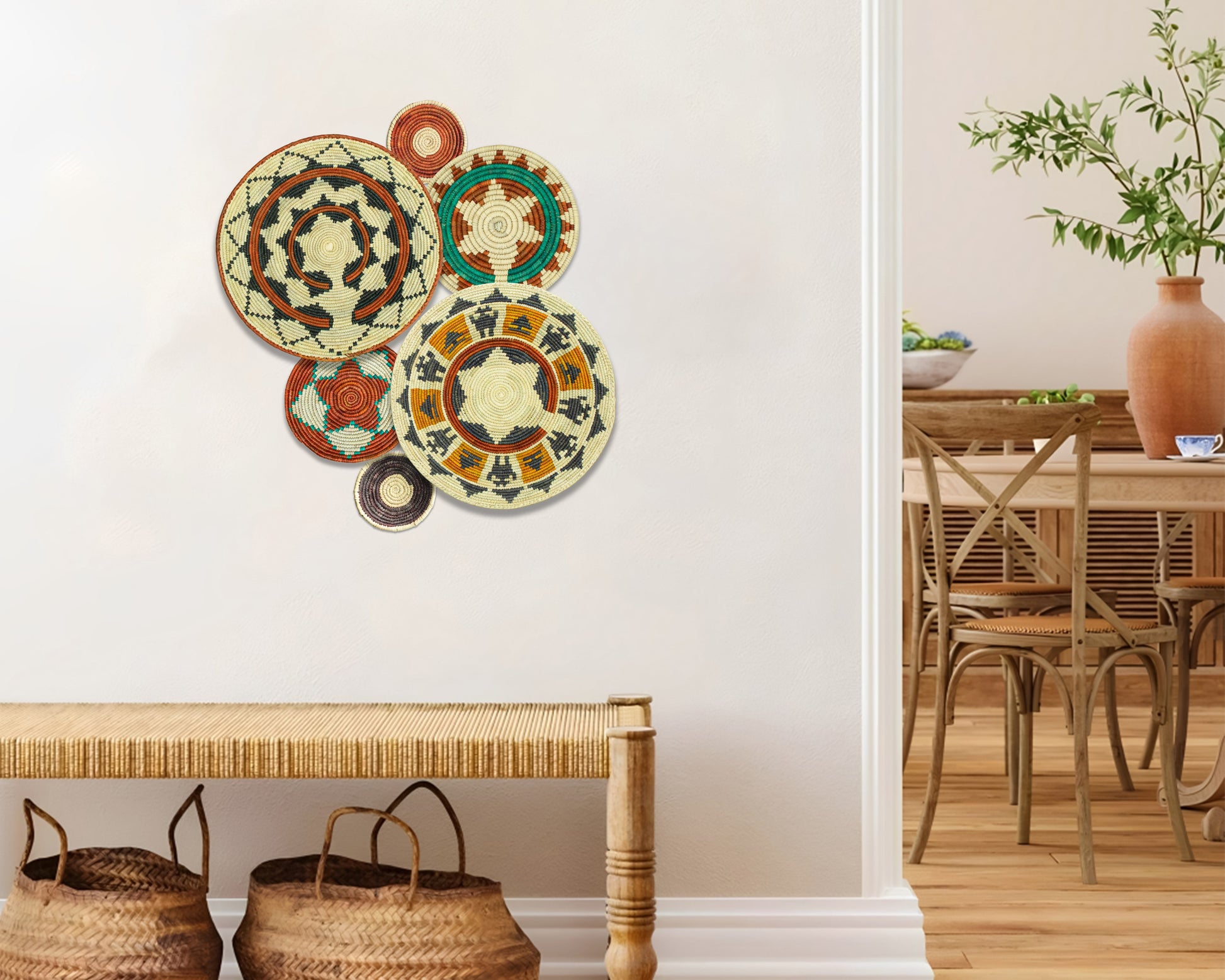Each basket in this set is uniquely woven by skilled artisans, ensuring one-of-a-kind patterns and intricate details that add depth and character to any space. Whether you arrange them as a statement wall display, use them as tabletop decor, or incorporate them into a gallery wall, these baskets effortlessly enhance Boho, farmhouse, rustic, and modern interiors.