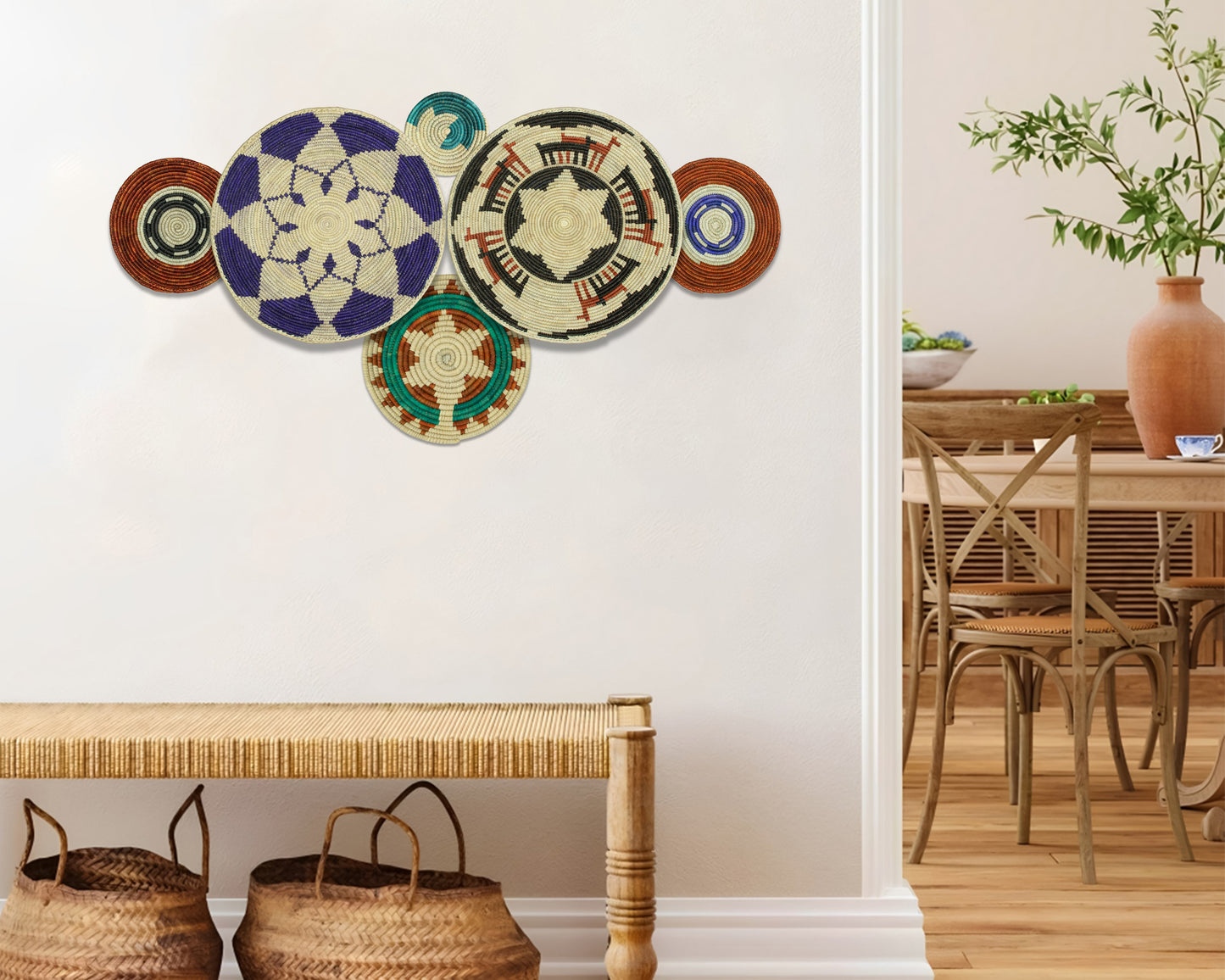 Each basket in this set is uniquely woven by skilled artisans, ensuring one-of-a-kind patterns and intricate details that add depth and character to any space. Whether you arrange them as a statement wall display, use them as tabletop decor, or incorporate them into a gallery wall, these baskets effortlessly enhance Boho, farmhouse, rustic, and modern interiors.