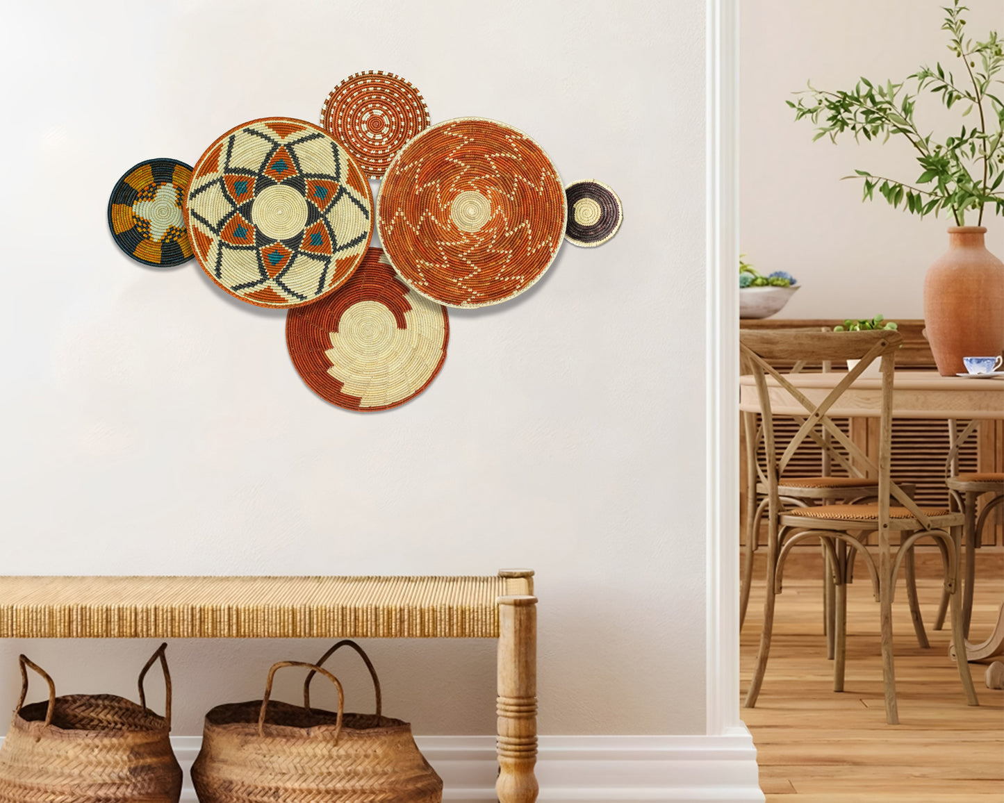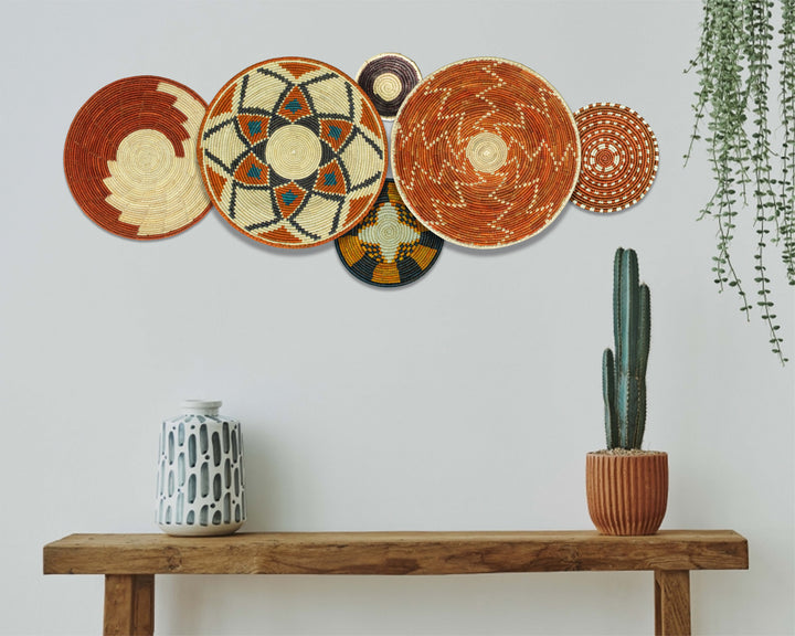 Each basket in this set is uniquely woven by skilled artisans, ensuring one-of-a-kind patterns and intricate details that add depth and character to any space. Whether you arrange them as a statement wall display, use them as tabletop decor, or incorporate them into a gallery wall, these baskets effortlessly enhance Boho, farmhouse, rustic, and modern interiors.