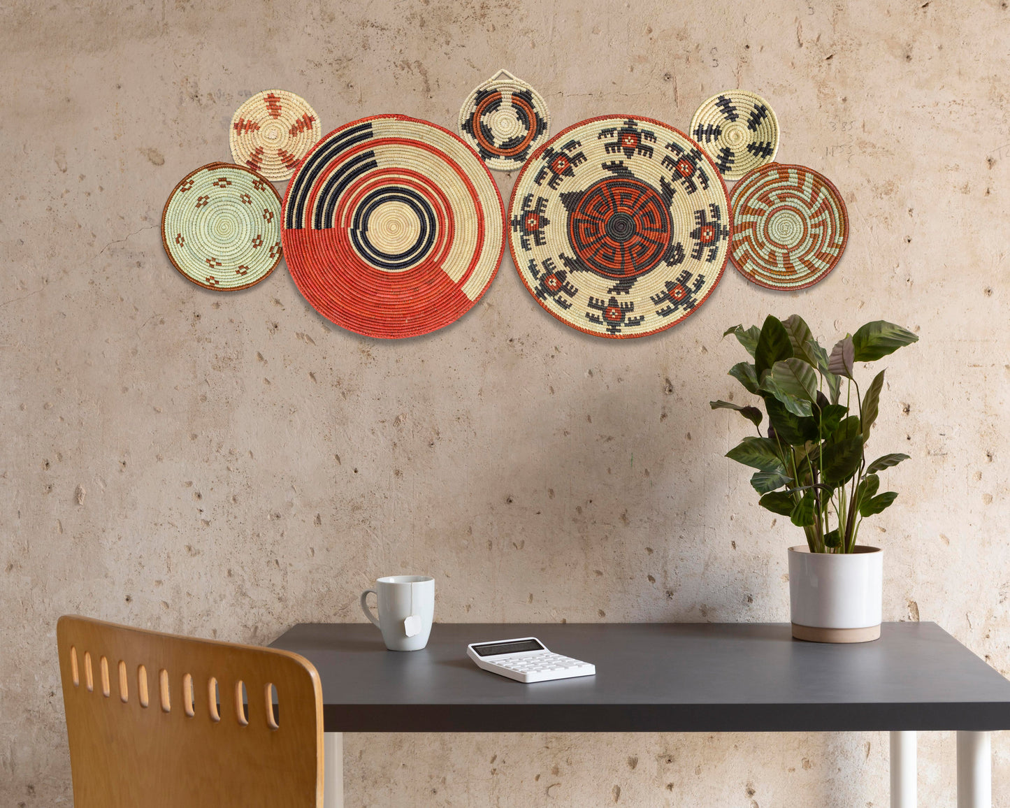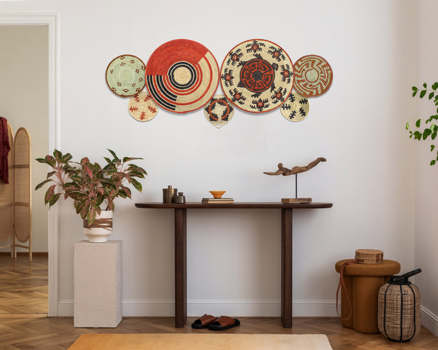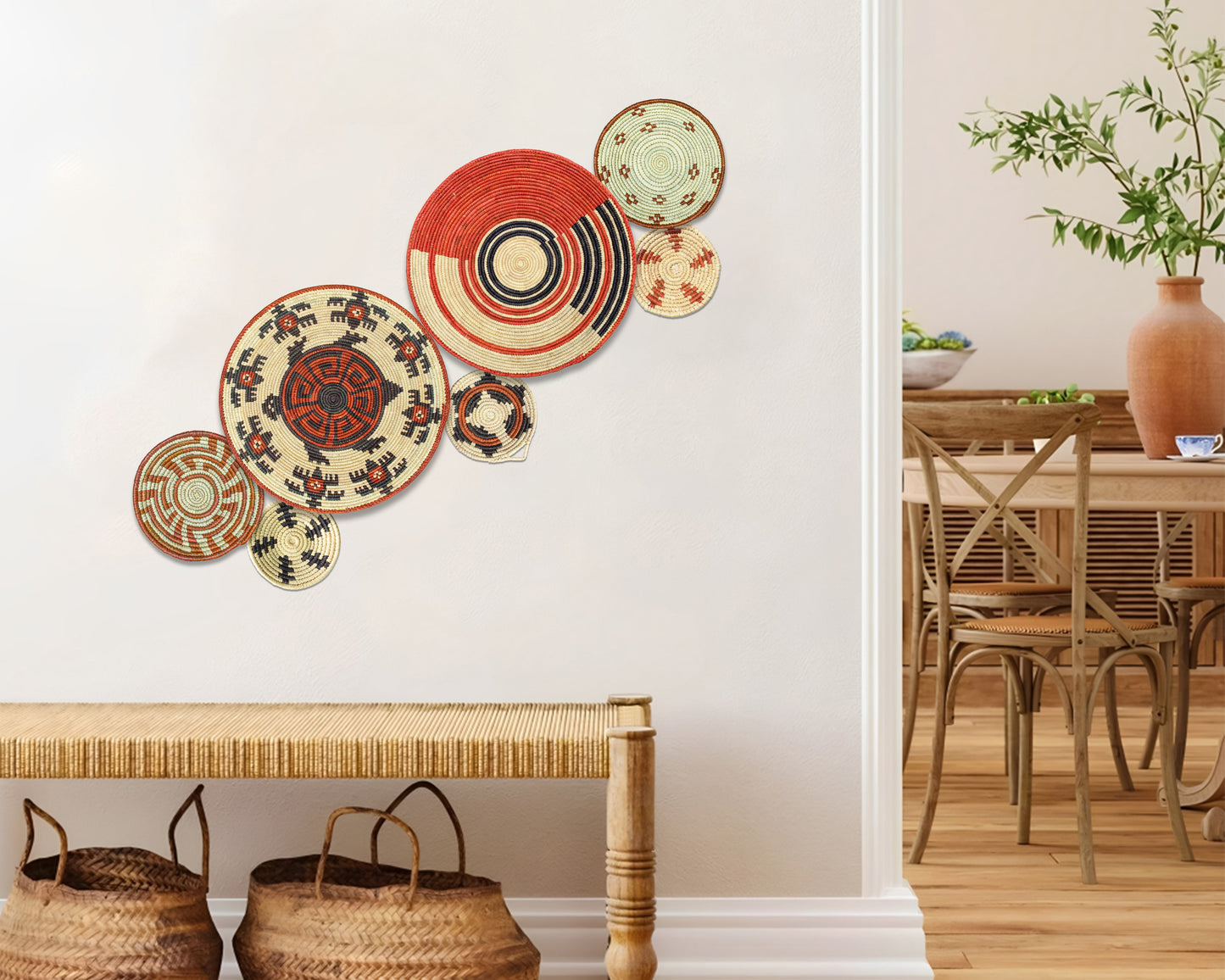 Each basket in this set is uniquely woven by skilled artisans, ensuring one-of-a-kind patterns and intricate details that add depth and character to any space. Whether you arrange them as a statement wall display, use them as tabletop decor, or incorporate them into a gallery wall, these baskets effortlessly enhance Boho, farmhouse, rustic, and modern interiors.