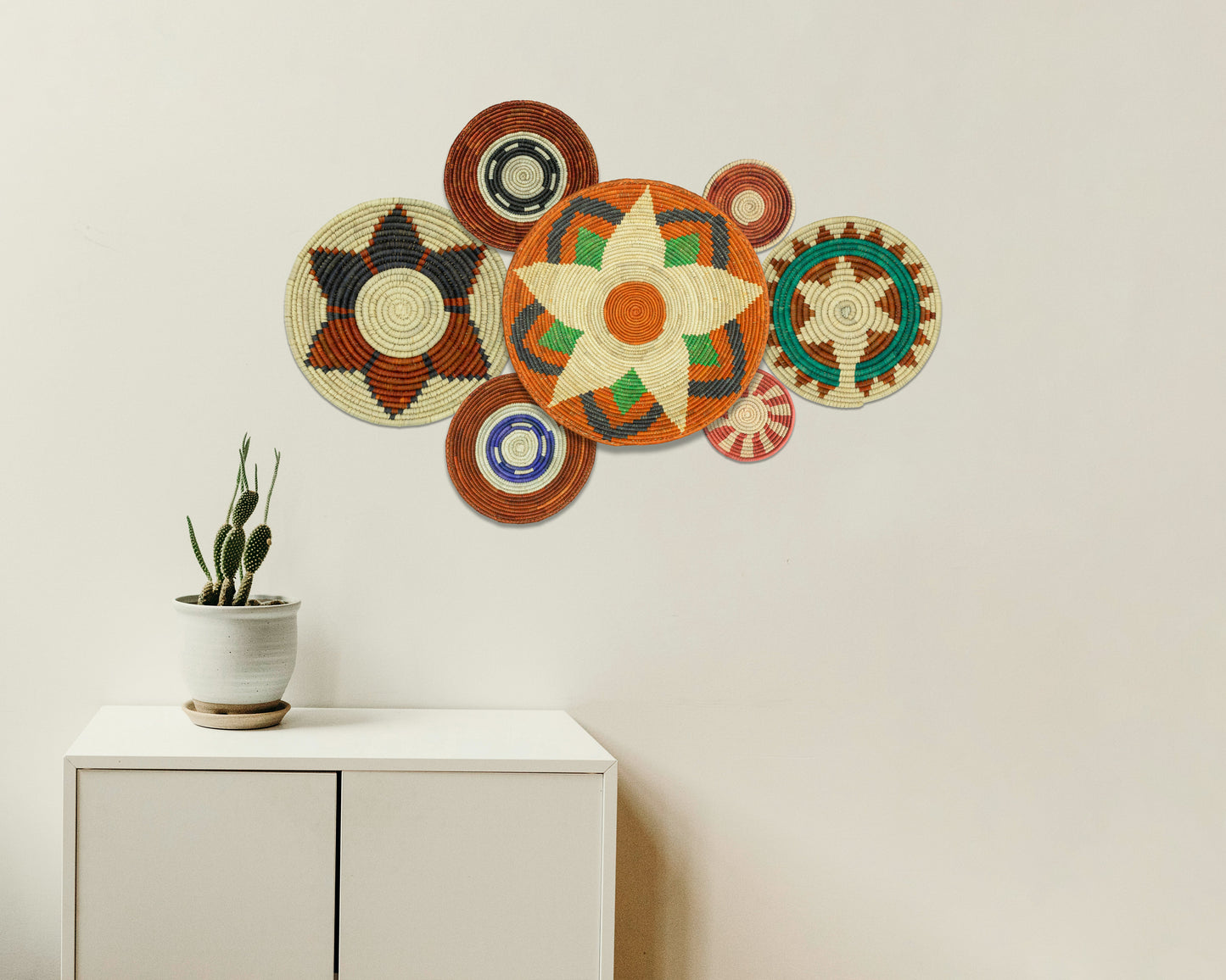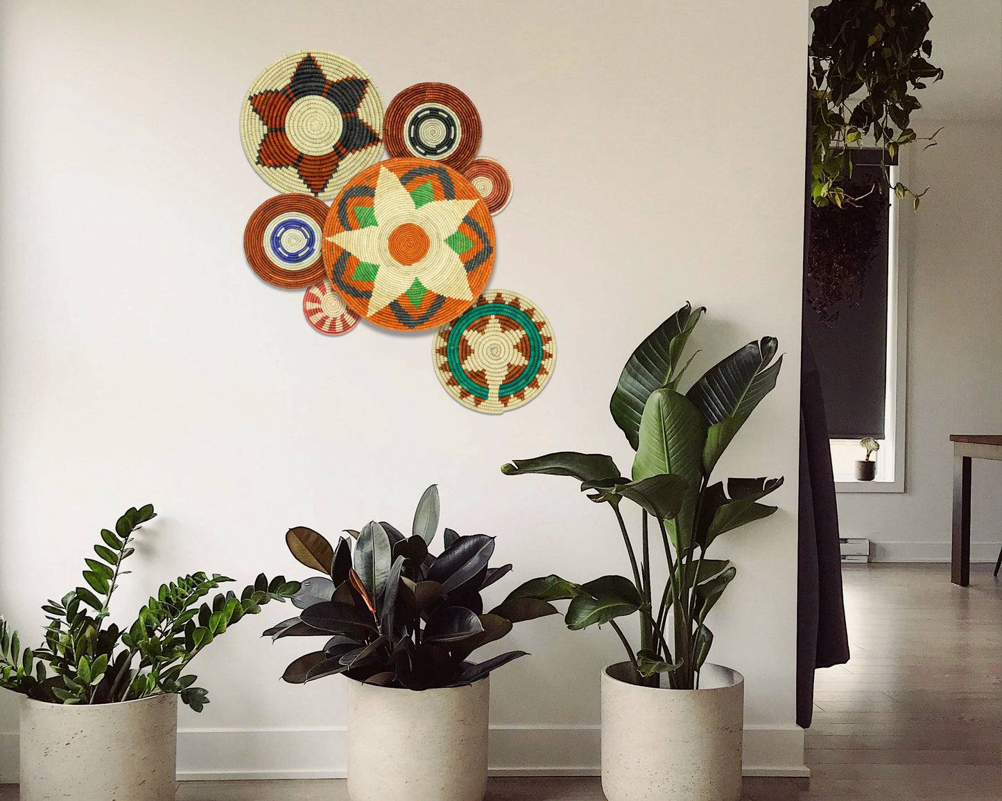 Each basket in this set is uniquely woven by skilled artisans, ensuring one-of-a-kind patterns and intricate details that add depth and character to any space. Whether you arrange them as a statement wall display, use them as tabletop decor, or incorporate them into a gallery wall, these baskets effortlessly enhance Boho, farmhouse, rustic, and modern interiors.