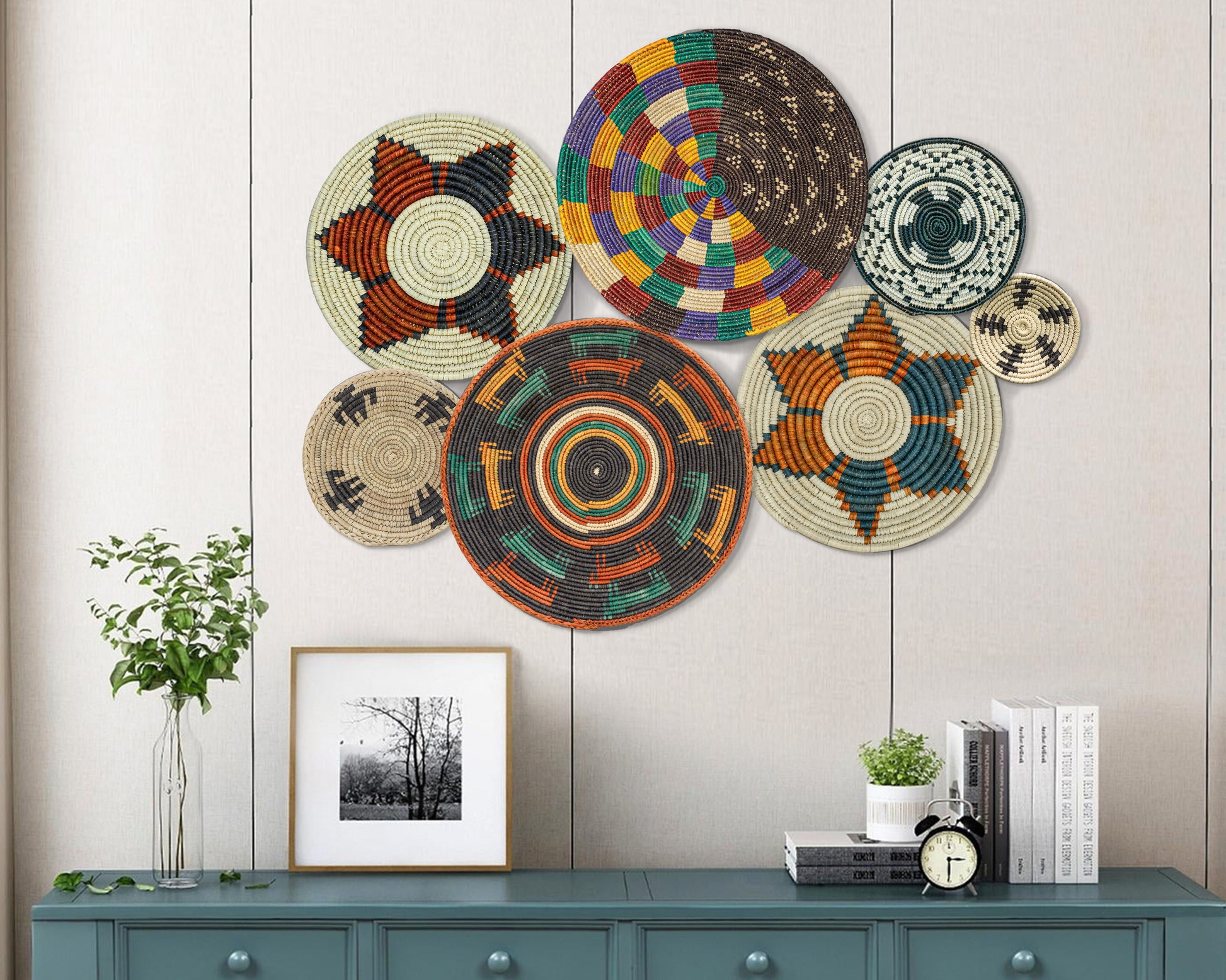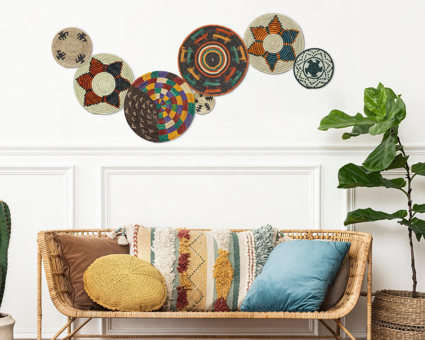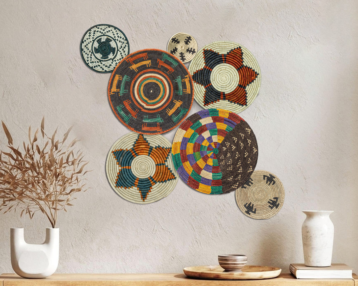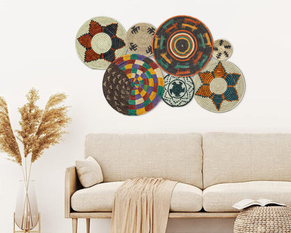 Each basket in this set is uniquely woven by skilled artisans, ensuring one-of-a-kind patterns and intricate details that add depth and character to any space. Whether you arrange them as a statement wall display, use them as tabletop decor, or incorporate them into a gallery wall, these baskets effortlessly enhance Boho, farmhouse, rustic, and modern interiors.