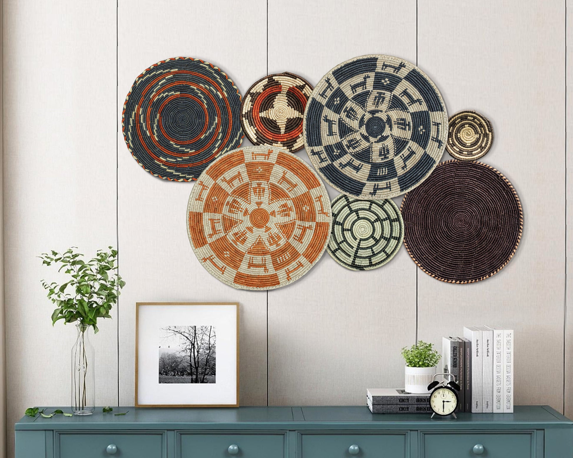 Each basket in this set is uniquely woven by skilled artisans, ensuring one-of-a-kind patterns and intricate details that add depth and character to any space. Whether you arrange them as a statement wall display, use them as tabletop decor, or incorporate them into a gallery wall, these baskets effortlessly enhance Boho, farmhouse, rustic, and modern interiors.