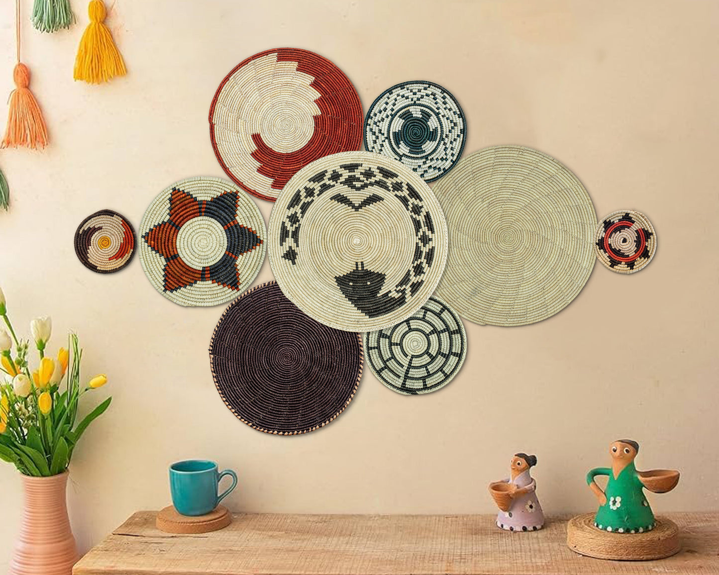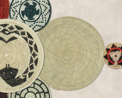 Bring warmth, texture, and a boho-chic touch to your home with this set of 9 handwoven wall baskets. Made from natural seagrass and palm leaves, each basket is carefully woven by skilled female artisans using centuries-old techniques and dyed with eco-friendly vegetable dyes for a vibrant yet earthy look.