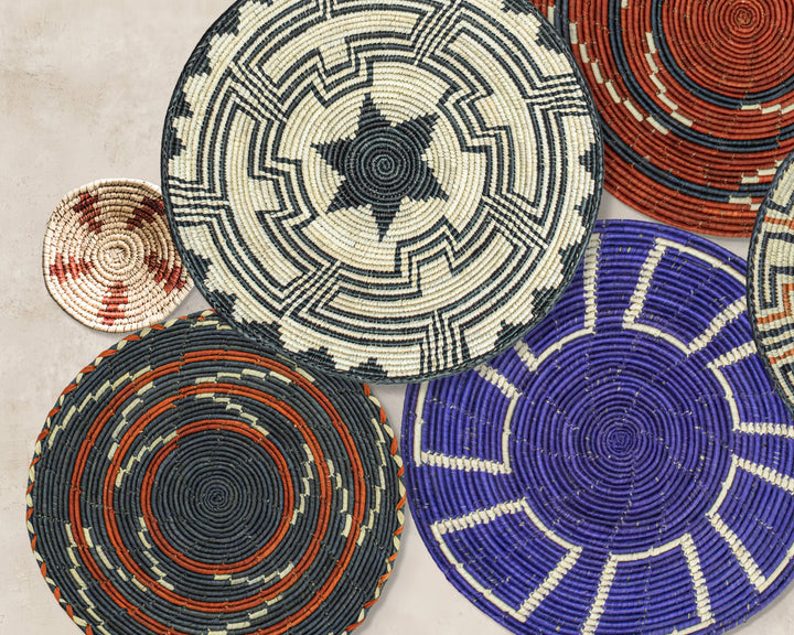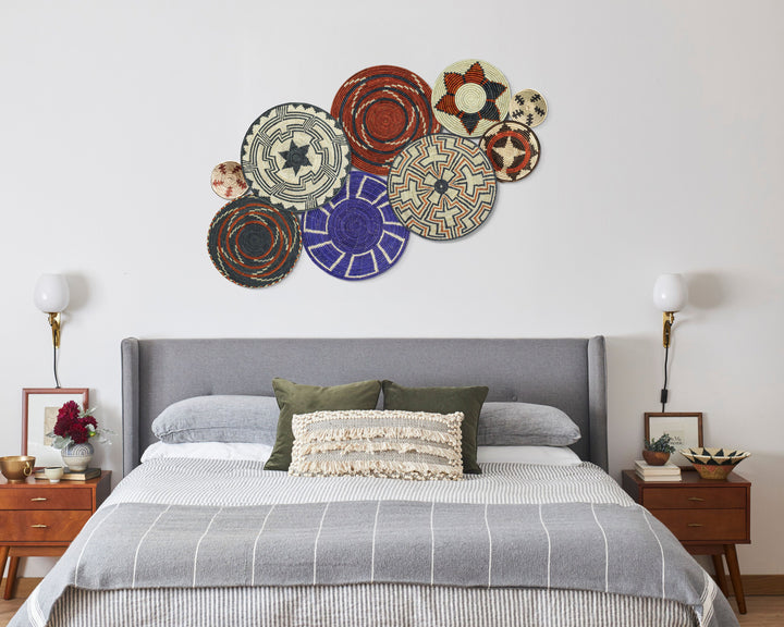 Bring warmth, texture, and a boho-chic touch to your home with this set of 9 handwoven wall baskets. Made from natural seagrass and palm leaves, each basket is carefully woven by skilled female artisans using centuries-old techniques and dyed with eco-friendly vegetable dyes for a vibrant yet earthy look.