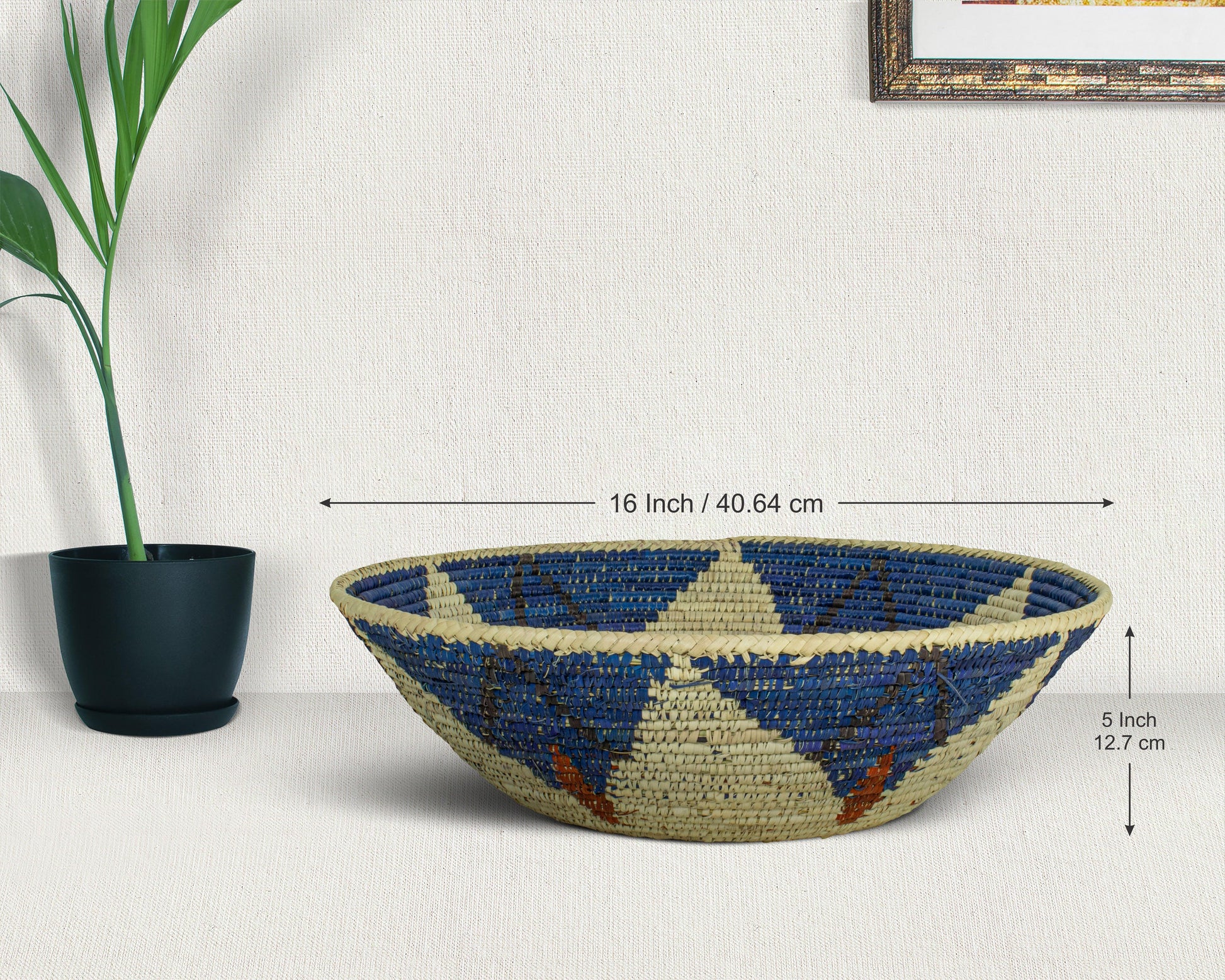 Elevate your space with the timeless charm of our 16-inch Handwoven Bowl Basket, a perfect blend of boho elegance, rustic warmth, and artisanal craftsmanship. Woven with care from natural palm leaves, sea grass, and plant-based dyes. This basket adds organic texture and a touch of heritage to your home. Whether displayed as a stunning wall decor piece, a stylish fruit bowl, or an entryway accent, its versatility shines through.