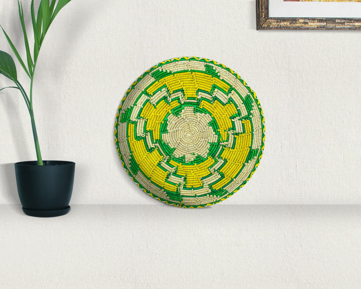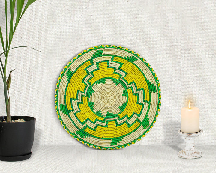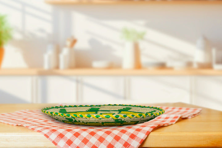 Bring warmth, texture, and artisanal beauty into your space with our bohemian elegance to your home with our 12-inch Handwoven Flat Basket - A perfect blend of rustic beauty and artisan craftsmanship. Woven from natural palm leaves, sea grass, and plant-based dyes. This stunning basket brings warmth, texture, and an organic feel to any space.